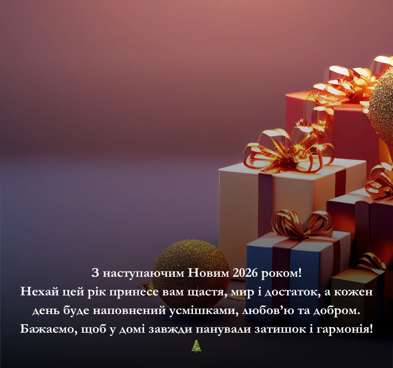 З наступаючим Новим 2026 роком!Нехай цей рік принесе вам щастя, мир і достаток, а кожен день буде наповнений усмішками, любов’ю та добром.Бажаємо, щоб у домі завжди панували затишок і гармонія! 🎄