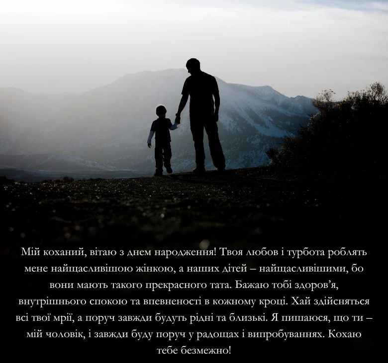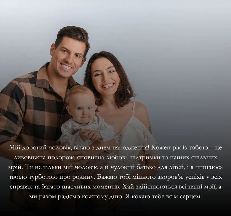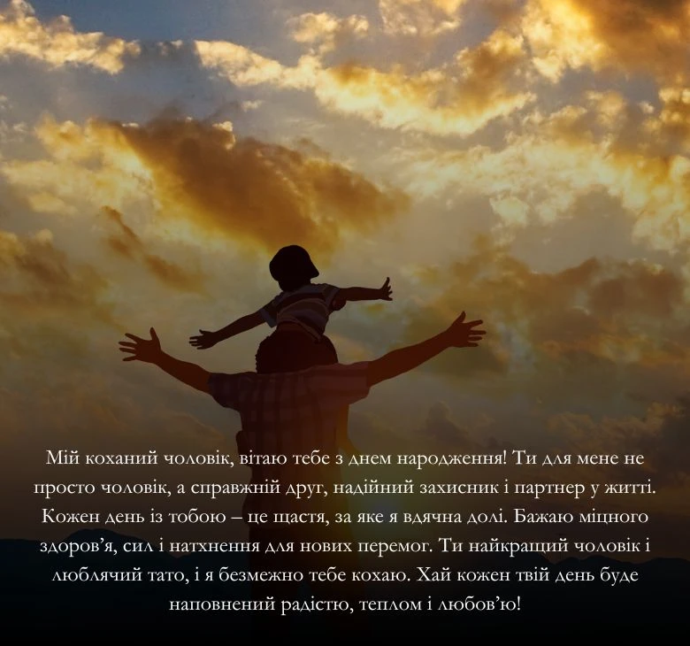 Мій коханий, вітаю з днем народження! Твоя любов і турбота роблять мене найщасливішою жінкою, а наших дітей – найщасливішими, бо вони мають такого прекрасного тата. Бажаю тобі здоров’я, внутрішнього спокою та впевненості в кожному кроці. Хай здійсняться всі твої мрії, а поруч завжди будуть рідні та близькі. Я пишаюся, що ти – мій чоловік, і завжди буду поруч у радощах і випробуваннях. Кохаю тебе безмежно!