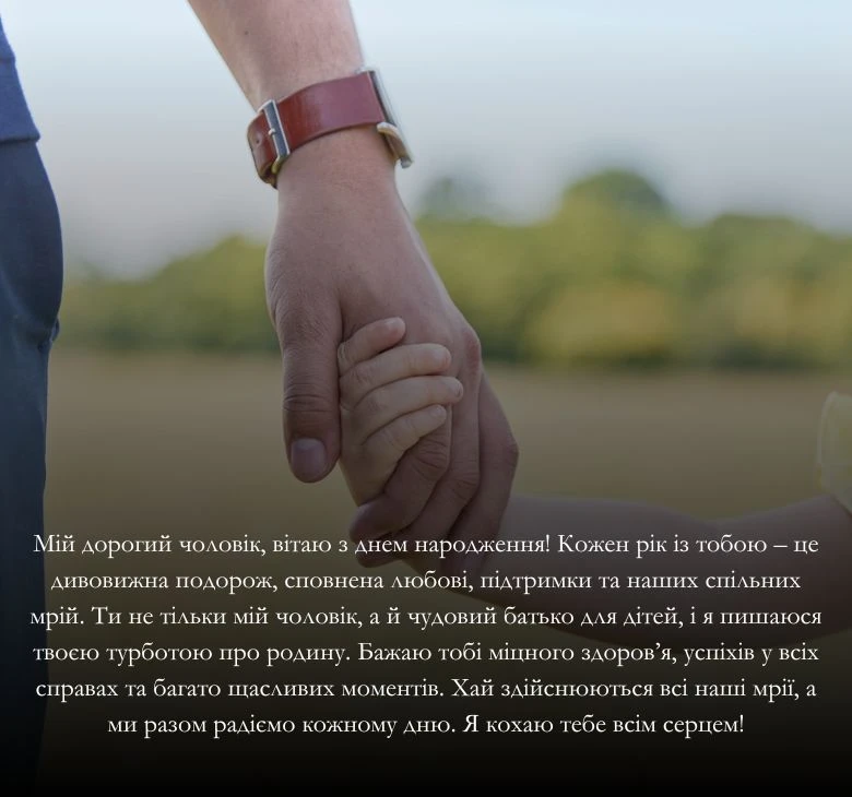 Мій дорогий чоловік, вітаю з днем народження! Кожен рік із тобою – це дивовижна подорож, сповнена любові, підтримки та наших спільних мрій. Ти не тільки мій чоловік, а й чудовий батько для дітей, і я пишаюся твоєю турботою про родину. Бажаю тобі міцного здоров’я, успіхів у всіх справах та багато щасливих моментів. Хай здійснюються всі наші мрії, а ми разом радіємо кожному дню. Я кохаю тебе всім серцем!
