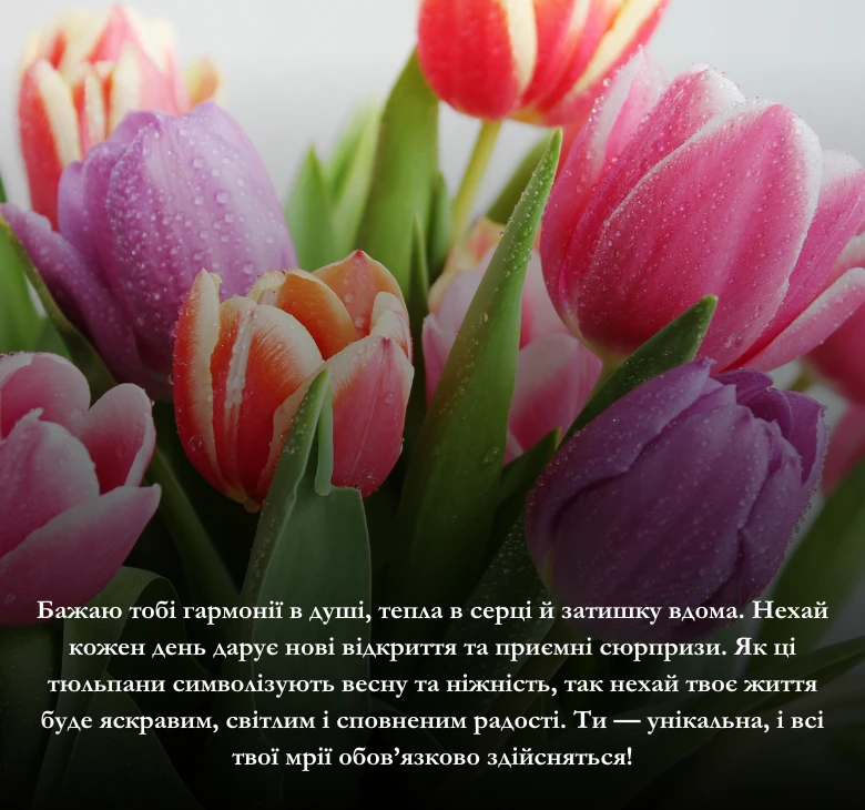Бажаю тобі гармонії в душі, тепла в серці й затишку вдома. Нехай кожен день дарує нові відкриття та приємні сюрпризи. Як ці тюльпани символізують весну та ніжність, так нехай твоє життя буде яскравим, світлим і сповненим радості. Ти — унікальна, і всі твої мрії обов’язково здійсняться!